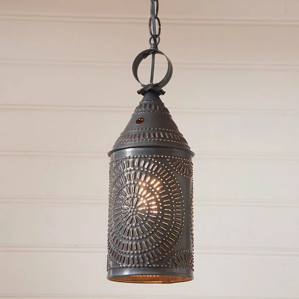 The beautiful punched chisel design on our 15" Hanging Lantern in Kettle Black is the statement lighting piece you've been searching for! Adding farmhouse ambiance to any look, the punched tin brings in texture and completes a soft or informal style. Pair two of them together over a kitchen island, make one your statement piece over your dining table or add soft ambiance to the corner of your living room and reading area. Regardless of where you decide to put your Hanging Lantern, it's sure to provide both comfortable lighting and add to your farmhouse design. Shown with a kettle black finish, the hanging lantern is made in the USA and comes with a rustic punched chisel design!