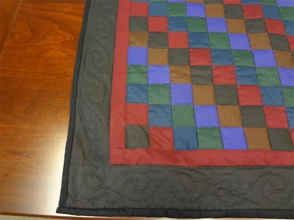 This Trip Around the World Wall hanging is hand quilted by an Old Order Amish woman in her home. The fabric choices are traditional Amish colors such as black, red and blues. The back of the quilt is also done in the black fabric. There is hand quilting done around the border in a swirl design.