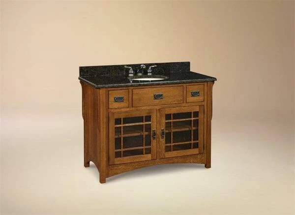 This bathroom vanity cabinet laboratory is Amish handcrafted in your choice of Oak Wood, Brown Maple Wood, Rustic Cherry Wood, Quarter Sawn White Oak Wood or Cherry Wood. It is shown in quarter sawn white oak wood with a Michael's Cherry finish which is our most popular wood and finish for Mission furniture.