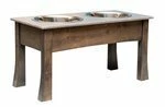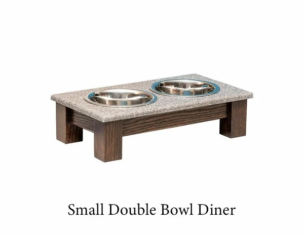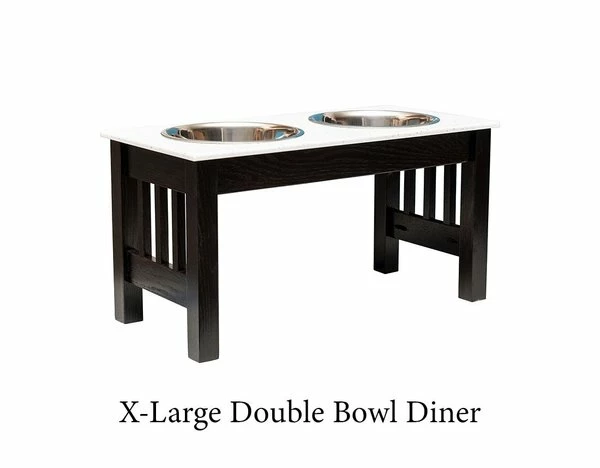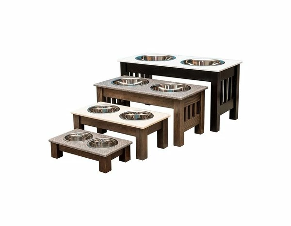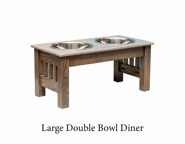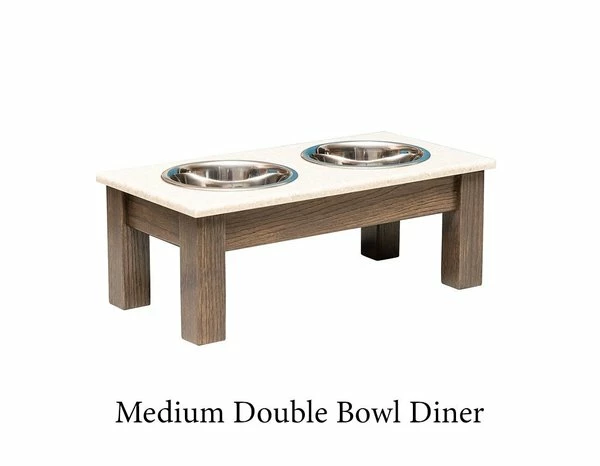 Delight in all the benefits for you and your pet with the Amish Double Bowl Dog Diner serving meals! This attractive dinnerware for dogs comes in four different sizes to serve you. With Corian tops and the solid wood you select, these beautiful bowls add to the decor of your cozy kitchen.