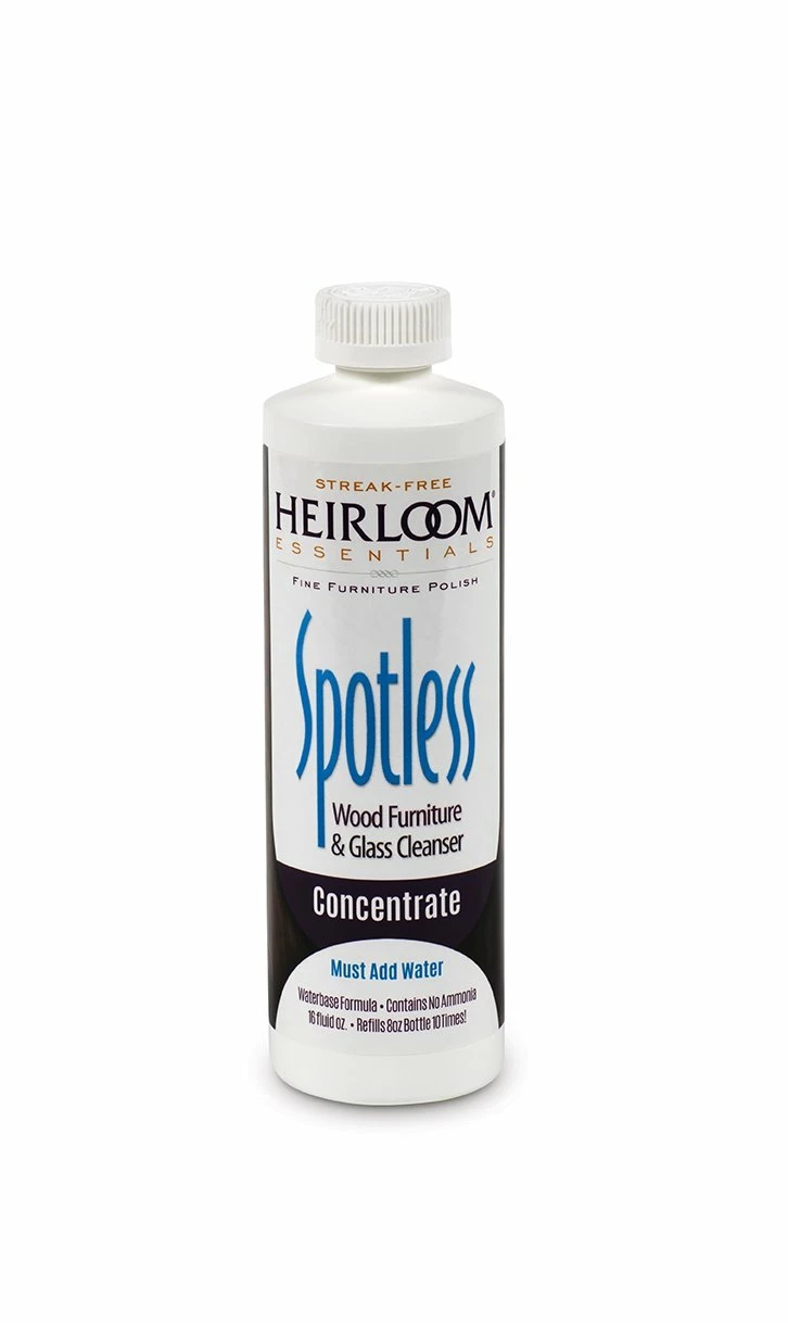 The Heirloom Essentials line has been tested and proven to protect your furniture best. This furniture and glass cleaner is a water based formula that contains no ammonia. 16 ounces of concentrate will refill an 8 ounce bottle ten times.