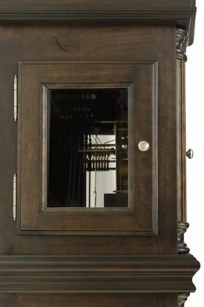 As you move down, a beautifully framed beveled glass door safely covers the polished brass lyre pendulum and weights, ensuring they can be seen in action, while remaining protected while accurately holding time. With no detail left out, this clock is sure to inspire plenty of awe from all that walk past.
