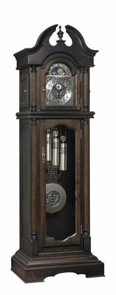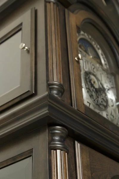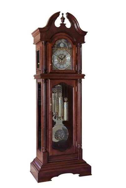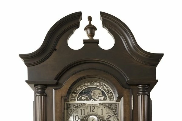 The large 88" frame is topped with a classically inspired swan neck arch, surrounding a finial detail in the middle that provides a beautiful, Old World antique feel to the entire piece. Below, two reeded columns surround a arched, beveled glass door that safely secures the beautiful details inside. Once open, you'll reveal the polished dial, complete with beautiful detailing around a classic numeral face and intricate hands that display the time. Above, a moon phased and calendar will give you the lunar cycle and day at a glance.