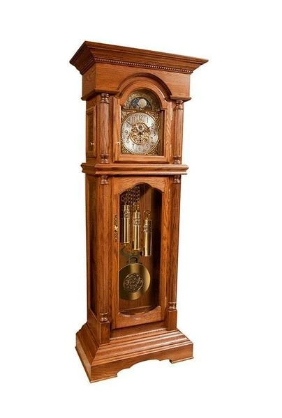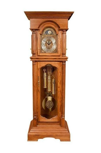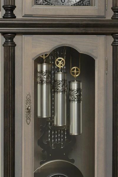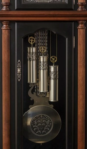 Below, an elegant molding around the case separates the dial from the pendulum, which is surrounded by column trim and covered by another beautifully designed glass door, so you can see everything in action. Open the door to reveal polished German made brass weight shells and a classically inspired pendulum – all functioning together to keep perfect time. Below, a beautiful egg and dart molding surround the ample base, ensuring your new clock will stand firm on any flooring surface.