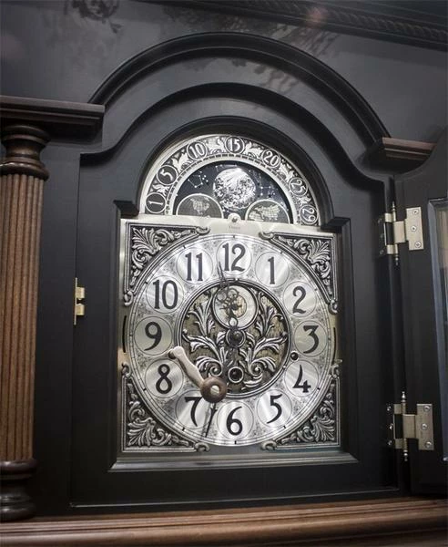 As a standard, the German made Hermle movement lies behind a beautiful polished brass dial, where intricate hand details move about to display the time. Above, a working moon phase dial will display where we are at in the lunar cycle and the date at a quick glance. To complete the piece, the winding mechanism is accessible through the face and comes with a beautiful brushed steel handle, complete with a wooden knob to tie everything together. The hinged glass door, surrounded by beautiful column moldings on each side, closes tightly to protect the dial and inner workings of your prized piece.