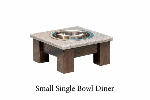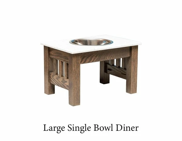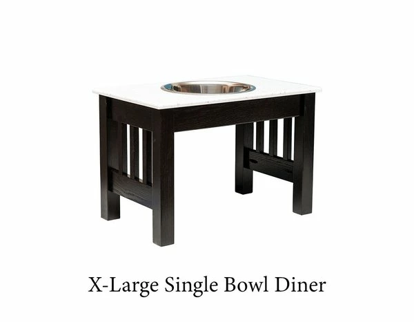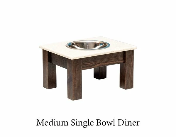Deluxe dining for your dog, the Amish Wood Elevated Single Dog Bowl with Corian Top makes for a neat and attractive doggy dinner table! The elevation makes it more comfortable for your dog as he or she dines. This dog bowl includes one bowl and is elevated on a solid wood stand. Larger models include mission slats on the sides and the corian top comes in 4 lovely colors!