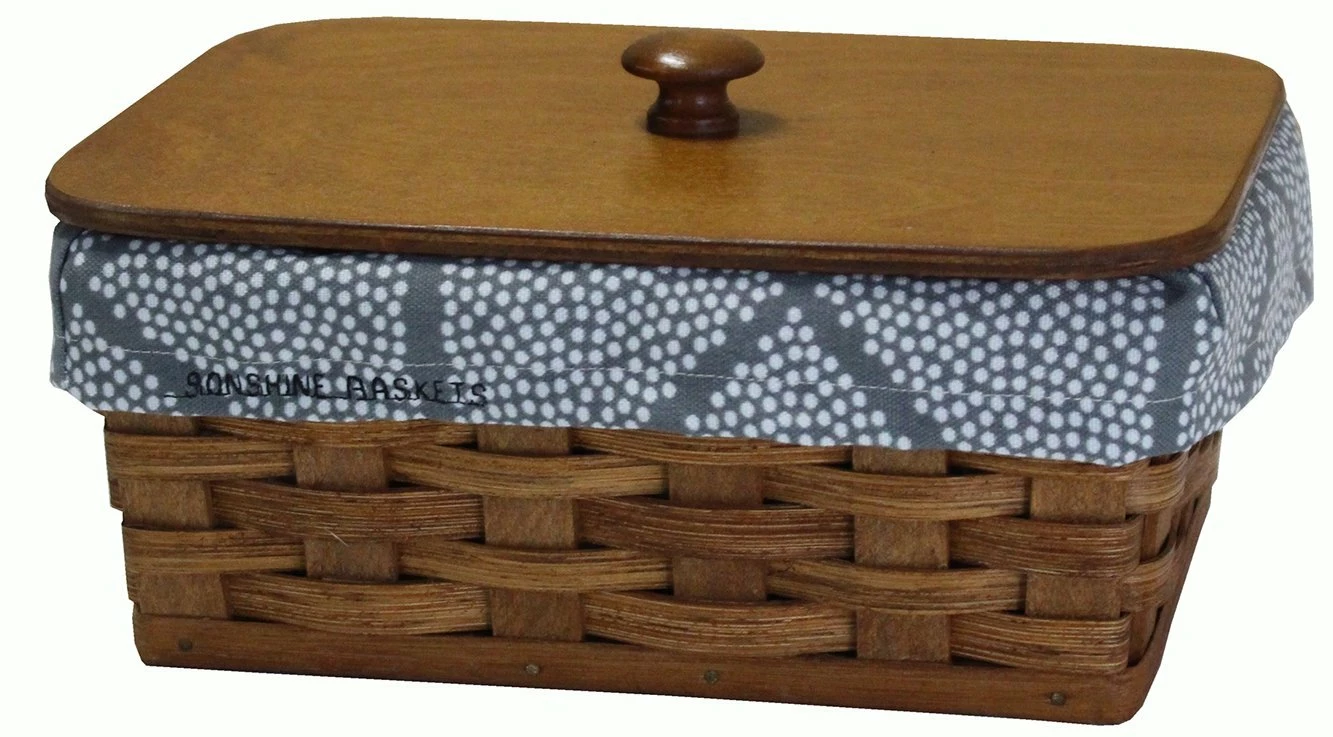 Weaving baskets is an art form that creates both beautiful and unique works of art while providing a solution to many of our common storage problems! Natural reed in a color of your choice is hand woven and shaped into a 10 inch long, 7 inch wide, and 5 inch deep basket with rounded corners. A liner in the pattern you choose is sewn to fit the size of the basket snuggly. The optional lid sits perfectly over the basket, allowing you to see the liner around all four sides of the basket. No matter what you need to store or use the basket for, do it in style!