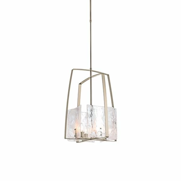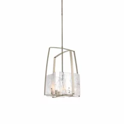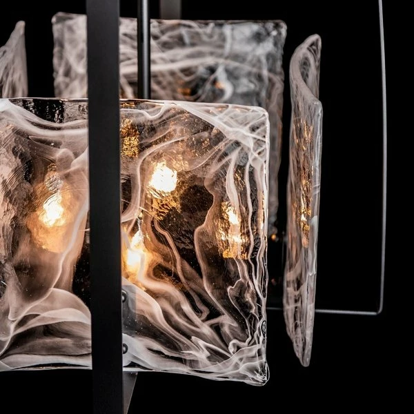 Four hand poured squared clear glass panels swirl with white color t convex feel. Sitting behind these individually unique glass panels are four bulb sockets allowing for ultimate lighting and clarity. The lighting is encased in four metal pieces arcing up, crisscrossing over the lamp in a stylish and contemporary fashion.
