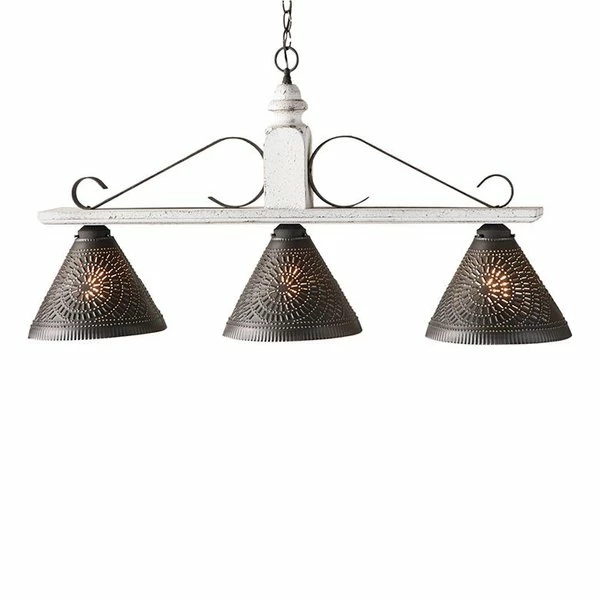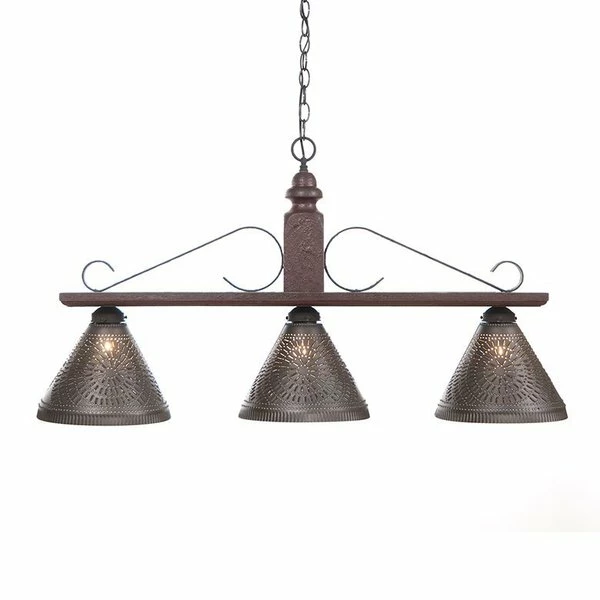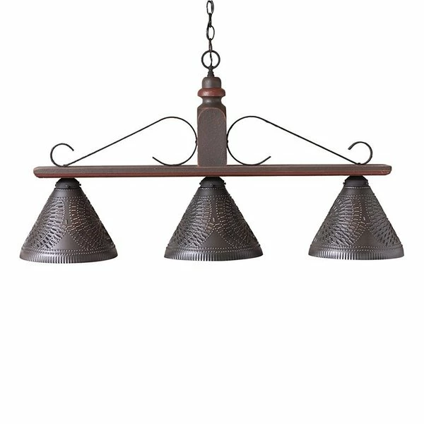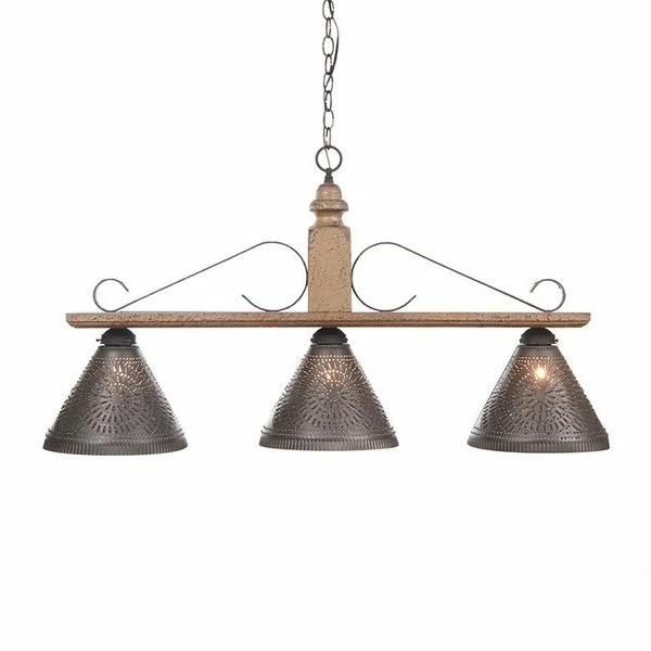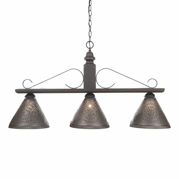 Lighting your home will complete any room design and finding the perfect style to enhance your area is key. The Large Wellington Island Light features a heavy, wooden crossbar in your choice of finish with wrought iron scrolls brackets, all accented with three Kettle Black shades.